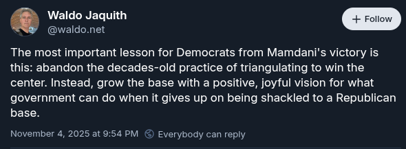 The most important lesson for Democrats from Mamdani’s victory is this: abandon the decades-old practice of triangulating to win the center. Instead, grow the base with a positive, joyful vision for what government can do when it gives up on being shackled to a Republican base.